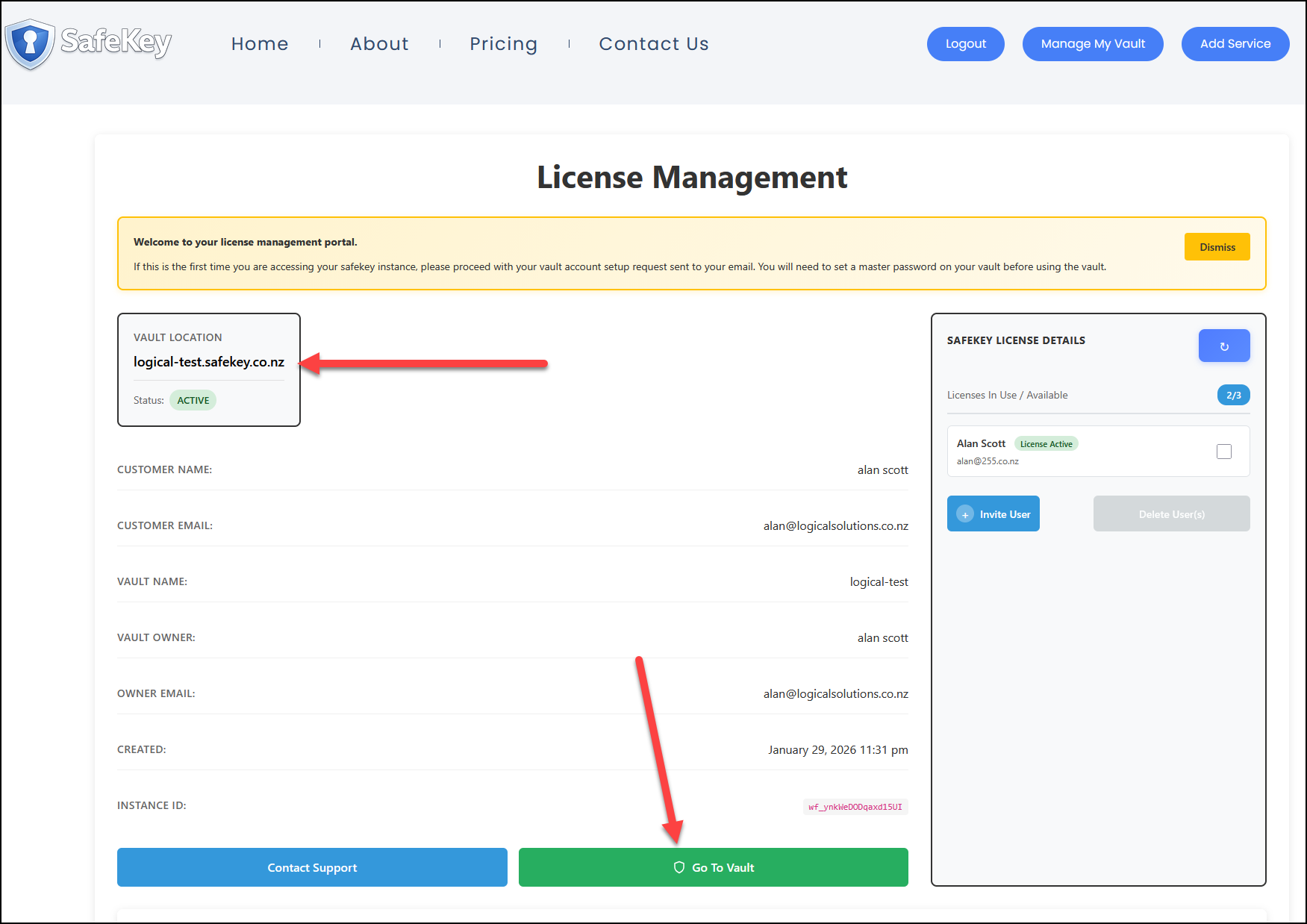 We now need to add a user to the organisation. Login to the Vaultwarden console (if you need help where to do this, connect to the license portal and use the link from there).
