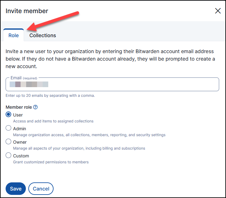 Add the email address of the user (as set up previously in the licensing portal) - assign a member role, in most cases, this will be "User"